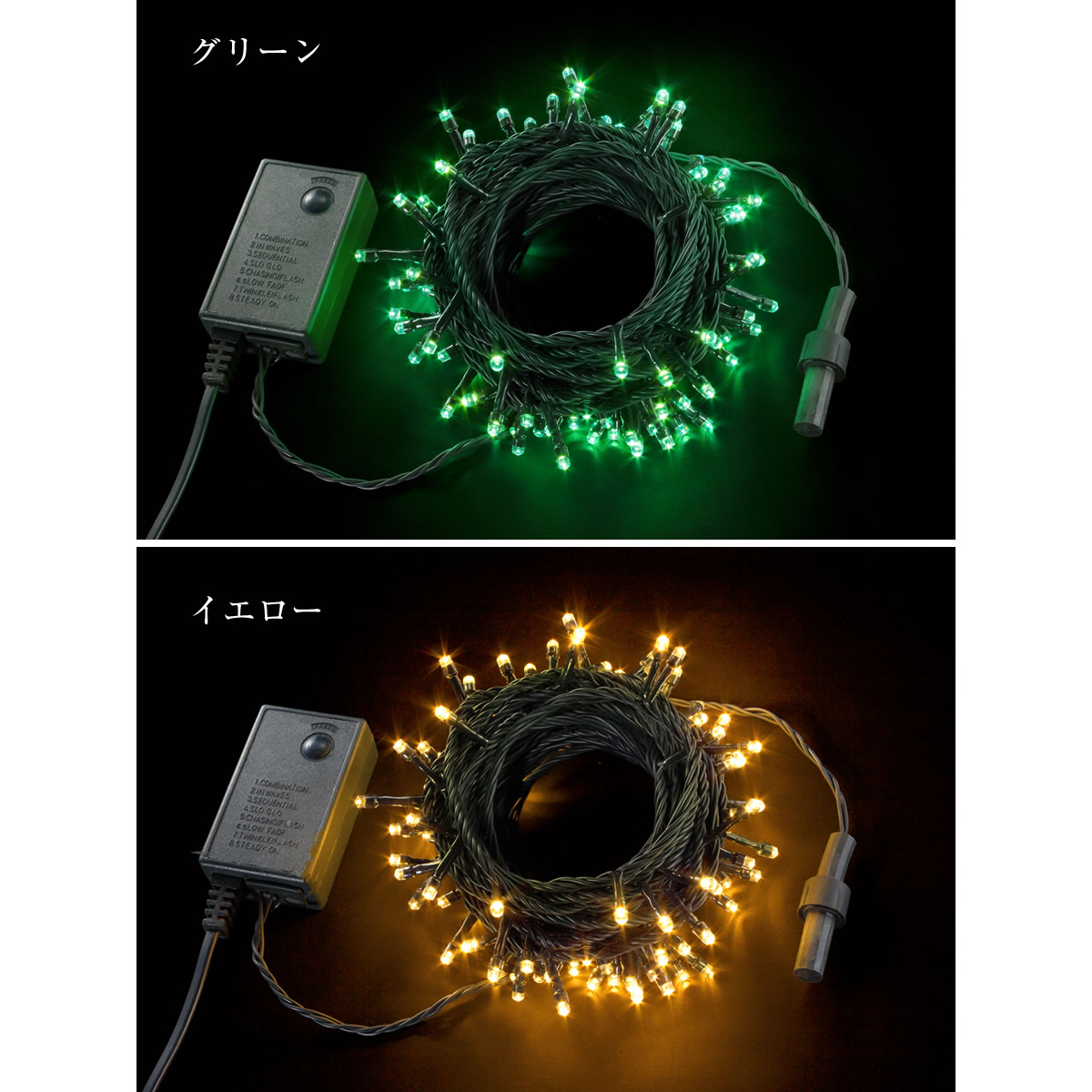 ミックス ブルー グリーン イエロー レッド ホワイト ピンク パープル シャンパンホワイト シャンパンゴールド ブルー&ホワイト エメラルド&ホワイト 【製品仕様】 製品名:ASH-TR100Lシリーズ 商品内容:LEDイルミネーション 100球ストレートタイプ メモリー機能内蔵コントローラー付 サイズ:(全長)約10m 配線ケーブルカラー:ボトルグリーン 電源;AC100V 50/60Hz 3.5W 付属品:取り扱い注意書 パッケージ:化粧箱 生産国:中国 電気用品安全法準拠(PSE取得済) ブランド:AD&C TORONIC 販売元:アシター商事 <注意事項> ※ライトセット部分は防水ですが、コントローラー部分及び連結部分は防滴仕様の為完全防水ではありません。