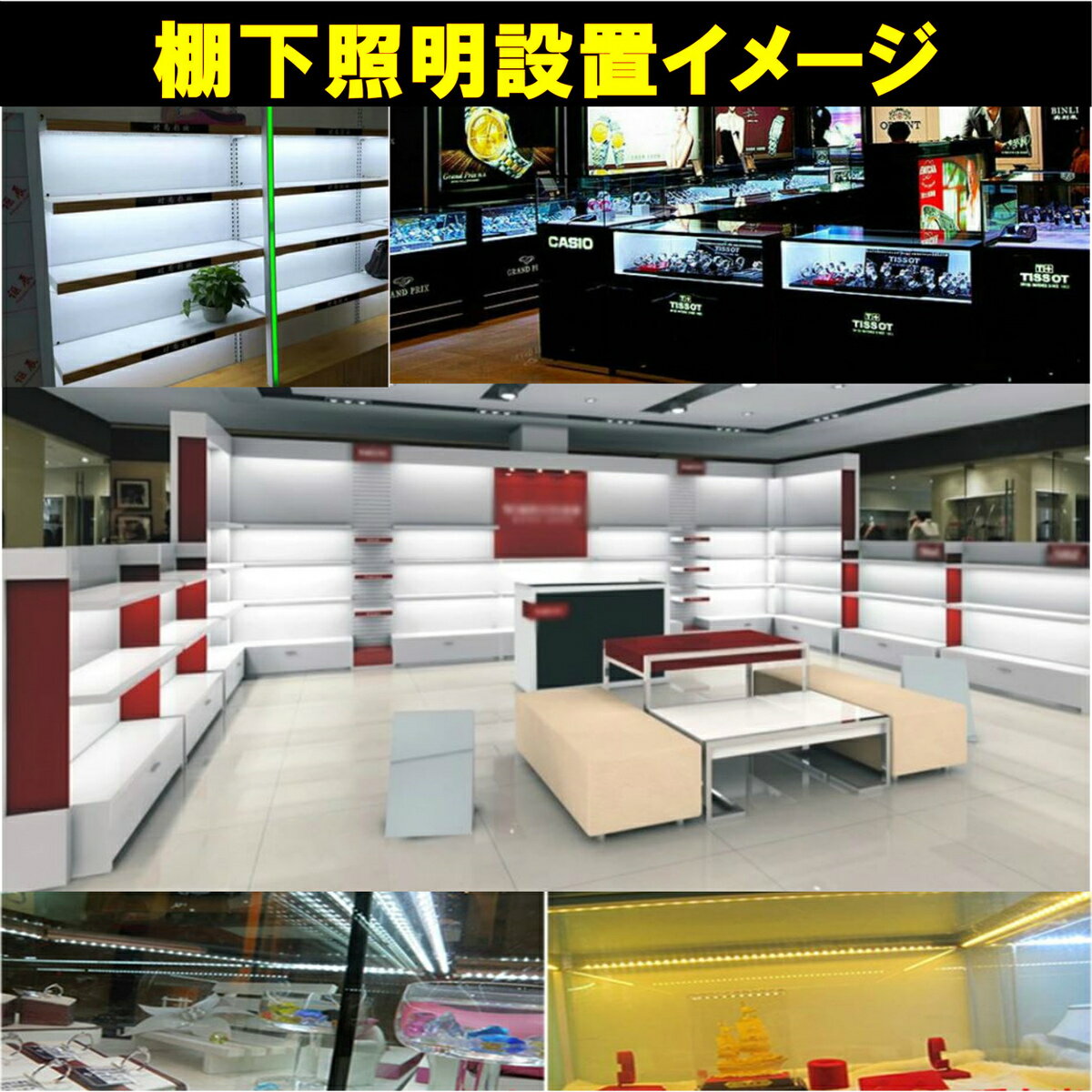 【特長】・90cm商品棚2段分の棚下照明テープライト2本とACアダプタ、 DC延長ケーブルセットです。