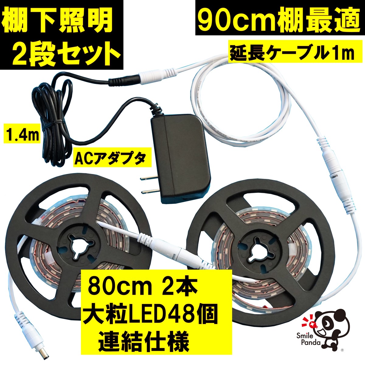 【セット内容】 90cm商品棚2段分 LEDテープ x 2、 DC延長ケーブル1m x 1本、 12V-2A PSE適合ACアダプタ x 1個 、電源ケーブル x 1本日本語説明書【仕様】 ・5050 LEDチップ48個/800mm 、テープ寸法 幅12mm、高さ4mm、長さ800mm、 電源AC100V、消費電力14.4W/m 最大6連結可、3連結以上は容量に応じた ACアダプタをご使用ください。
